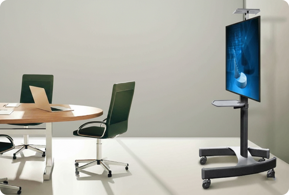 Universal heavy-duty design to support (72″–98″) displays, the floor mount can hold weight up to 287 lbs (130 kg), constructed from strong steel for maximum stability, integrated VC camera mount for conferencing setups, ideal for space-limited professional environments and commercial AV installations.